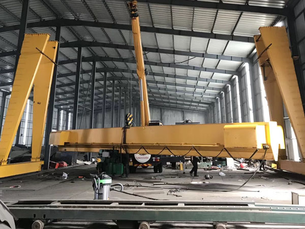 門式起重機是橋式起重機的一種變形,也叫龍門吊。主要用于室外的貨場、料場貨、散貨的裝卸作業(yè)。門式起重機具有場地利用率高、作業(yè)范圍大、適應面廣、通用性強等特點,在港口貨場得到廣泛使用。它的金屬結(jié)構(gòu)像門形框架,承載主梁下安裝兩條支腳,可以直接在地面的軌道上行走,主梁兩端可以具有外伸懸臂梁。